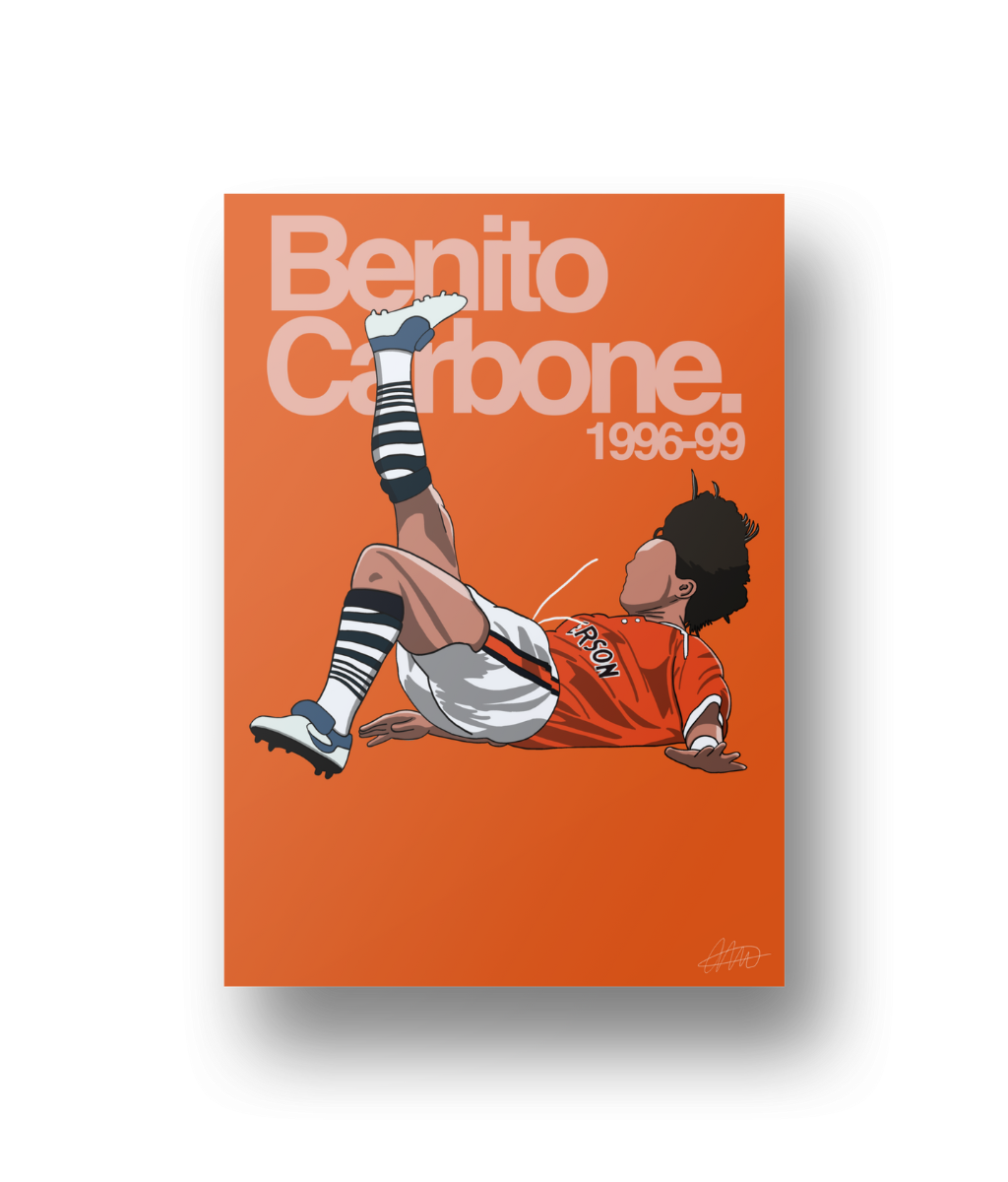 This special edition print features a legend of the game - Italian footballer Benito Carbone - in full Sheffield Wednesday glory. Printed on premium 170gsm silk paper, it's a perfect way to add a touch of football spirit to your space.
