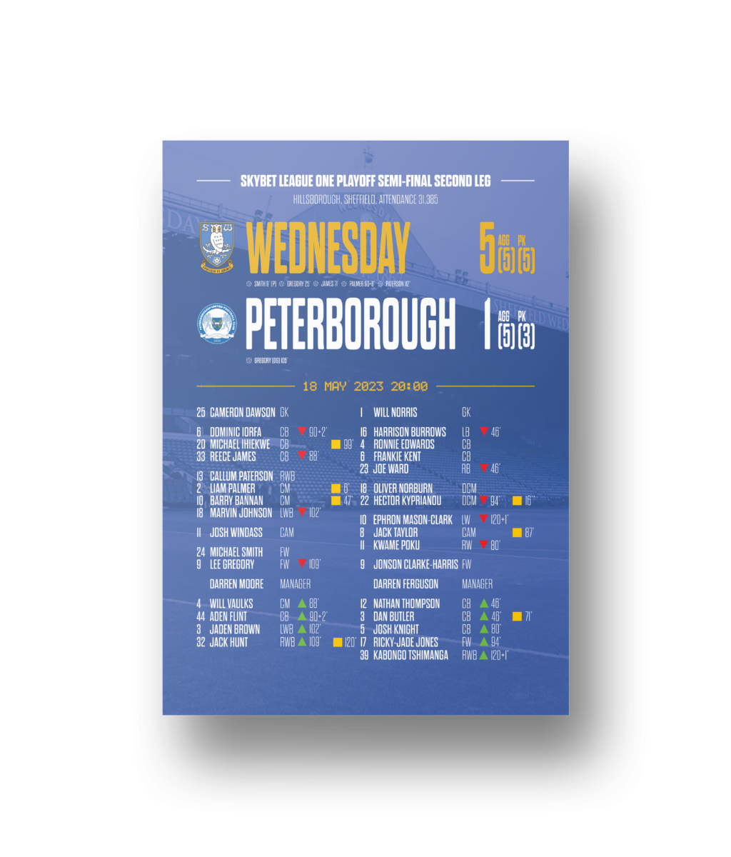 Relive the magic moments of the 22/23 play-off winners with Play-Off 22/23 - Print. Printed on 180gsm matte paper, this piece captures the excitement of Sheffield Wednesday's victory. A must-have for any fan looking to celebrate and remember this historic achievement.